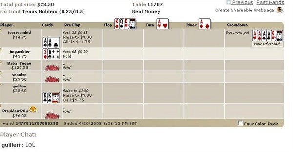 عادةً ما أتعب من أسئلة الخسارة الفادحة، لكن هذا السؤال كان مؤلمًا جدًا لدرجة يصعب تجاهلها. قبل توزيع الورقة الأولى، يكون احتمال هزيمة أربعة ملوك بأربعة آسات، في لعبة ثنائية اللاعبين، مع وجود أزواج جيب لكلا اللاعبين، هو 2* combin (4,2)*comb(4,2)*44/(comb(52,2)*comb(50,2)*comb(48,5)) = 2*6*6*44/(1326*1225*1712304) = 1 من 877,961,175. هذه لعبة لستة لاعبين، لذا يوجد combin(6,2) = 15 زوجًا مختلفًا من اللاعبين. في لعبة بستة لاعبين، يكون الاحتمال أعلى بـ 15 مرة، أو 1 من 58,530,745. بعد توزيع البطاقات المخفية المشار إليها، وقبل الفلوب، فإن احتمالية انتهاء اليد بنفس النتيجة هي 1 من 38,916.