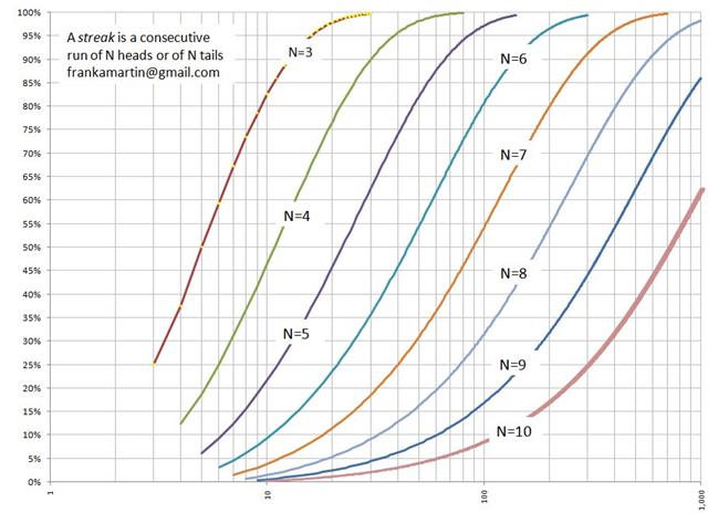 إذا قمت برمي عملة معدنية 1000 مرة، ما هو احتمال أن أرى سلسلة من 10 صور أو كتب على التوالي؟
