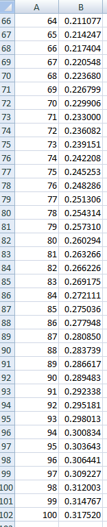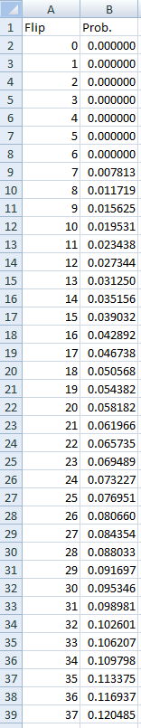 ثم نسختها ولصقتها من الخلية B10 إلى الخلية B102، وهو ما يعادل 100 انعكاس. هذا الاحتمال هو 0.317520. وقد أكدته محاكاة عشوائية.
