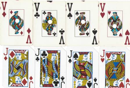 لأكون صادقًا، لست متأكدًا تمامًا. كانوا يُعرفون سابقًا باسم "Knaves"، ولكن في مرحلة ما أصبحوا يُعرفون باسم "Jacks". ربما في الوقت الذي بدأوا فيه بوضع الأرقام والحروف على البطاقات (لم يكونوا يفعلون ذلك من قبل)، وكان الأمر محيرًا لأن كلاً من "King" و"Knave" يبدأ بحرف "K". هذا يطرح سؤالًا: ما هو "Knave"؟ يقدم لنا موقع dictionary.com هذه التعريفات، بالإضافة إلى استخدام أوراق اللعب: