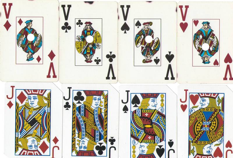 يبدو أن هذا يتوافق مع معنى "الخادم الذكر" الإنجليزي. مع ذلك، لستُ مرتاحًا تمامًا لهذا، لأنه إذا كان هذا هو المعنى، فكيف تحوّلوا من "Knave" إلى "Jack"؟ أقترح أن الترجمة الأفضل، لتجنب الكلمات التي تبدأ بحرفي K وQ، هي اتباع الفرنسية واستخدام كلمة "Valet"، التي تحمل معنى مشابهًا في الإنجليزية. إليكم استخدامات dictionary.com لكلمة "Valet":
