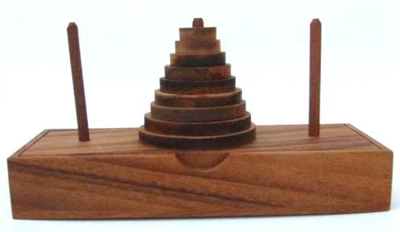 لغز برج هانوي. لفائدة القراء، يتكون اللغز من ثلاثة أوتاد وأي عدد من القطع، كل منها بنفس الشكل ولكن بأحجام مختلفة. في البداية، يجب أن تكون جميع القطع على وتد واحد، بالترتيب، بحيث يكون الأكبر في الأسفل. الهدف هو نقل المجموعة بأكملها إلى وتد آخر. مع ذلك، لا يُسمح بنقل أي قطعة فوق قطعة أصغر. إليك نسخة إلكترونية من اللعبة.