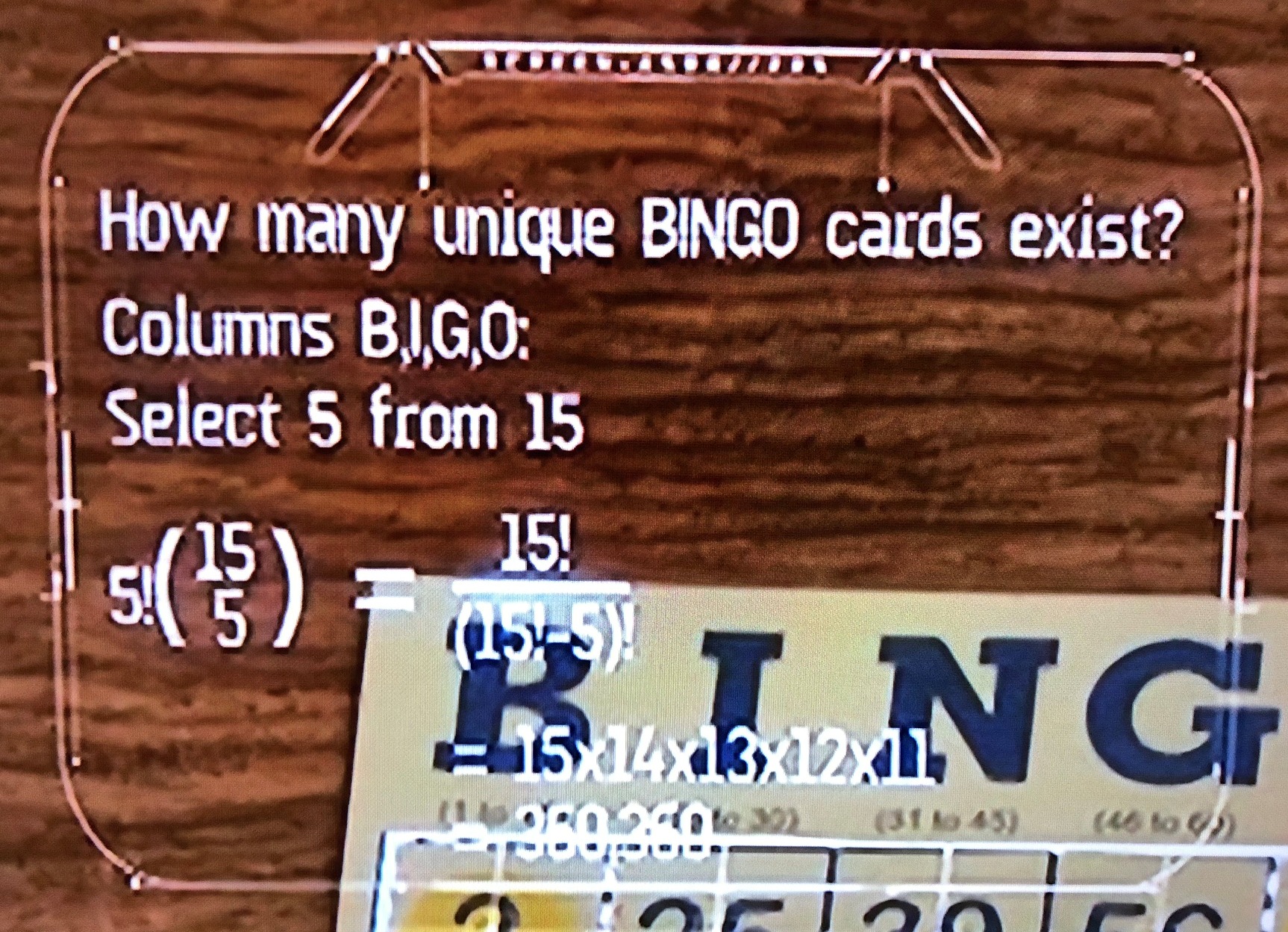 في البرنامج، يتساءل شيلدون عن كيفية وجود بطاقات بنغو فريدة. بناءً على الصيغ الخاطئة لاحقًا، أفترض أنه يقصد التباديل. بمعنى آخر، بطاقتان بنفس الأرقام ولكن في مواقع مختلفة ستكونان فريدتين.