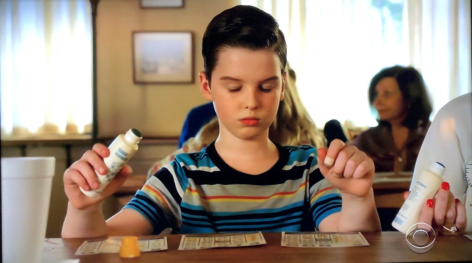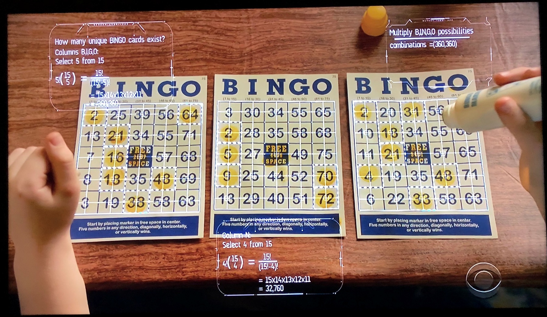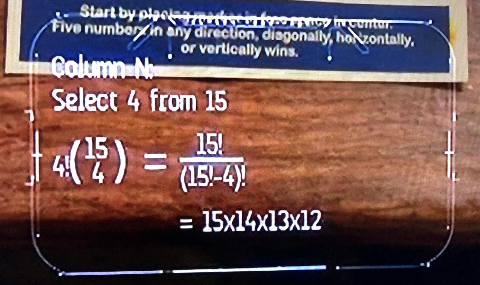 تُظهر الصورة أعلاه صيغة شيلدون للأعمدة B وI وG وO. في البداية، حصل على الصيغة الصحيحة عند 5! × combin(15,5). إلا أنه بسّطها بشكل خاطئ إلى 15!/(15!-5)!. كان من المفترض ألا تظهر علامة التعجب الثانية، بل 15!/(15-10)!. ثم عاد إلى الإجابة الصحيحة عند 360,360.