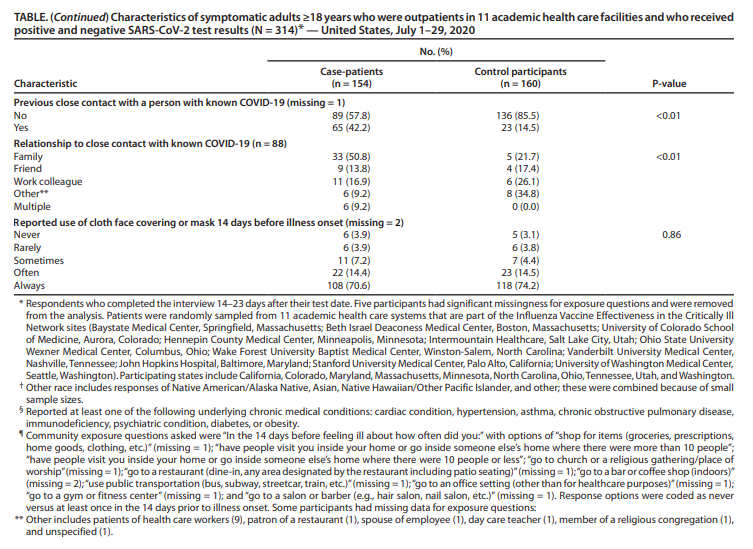 تشير نسبة 85% إلى الجدول الوارد في الصفحة الرابعة من تقرير " التعرضات المجتمعية والمخالطة المباشرة المرتبطة بكوفيد-19 بين البالغين الذين تظهر عليهم الأعراض والذين تبلغ أعمارهم 18 عامًا فأكثر في 11 منشأة رعاية صحية خارجية - الولايات المتحدة، يوليو 2020" الصادر عن مركز مكافحة الأمراض والوقاية منها. إليكم هذا الجدول.