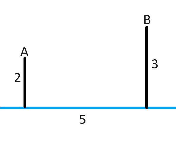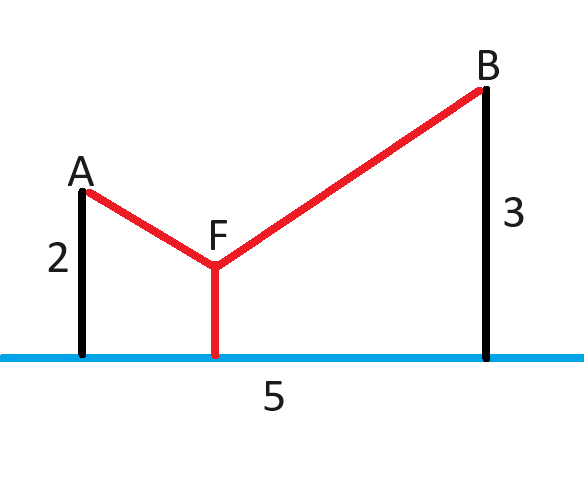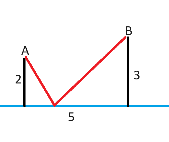 يوجد أنبوب مياه مستقيم (أزرق) بالقرب من النقطتين أ و ب. تبعد النقطة أ ميلين عن أقرب نقطة على الأنبوب. تبعد النقطة ب ثلاثة أميال عن أقرب نقطة على الأنبوب. النقطتان على طول الأنبوب اللتان تُمثلان أقرب نقطتين إلى أ و ب تفصل بينهما مسافة خمسة أميال. يُطلب مد أنبوبين جديدين (أحمر)، يربطان أ و ب بأنبوب الماء، بحيث يكون هناك نقطة اتصال واحدة فقط بأنبوب الماء، ويتجه الأنبوبان الجديدان مباشرةً إلى أ و ب. بمعنى آخر، يجب أن يكون الأنبوبان الجديدان على شكل حرف V. ما هي أقل مسافة مطلوبة للأنبوب؟