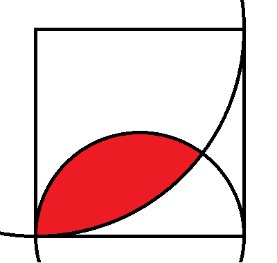 المربع أعلاه طول ضلعه ٢. أحد قوسيه دائرة نصف قطرها ١، والآخر ٢. ما مساحة المنطقة الحمراء؟ يُمكنك التعبير عن إجابتك باستخدام الدوال المثلثية.
