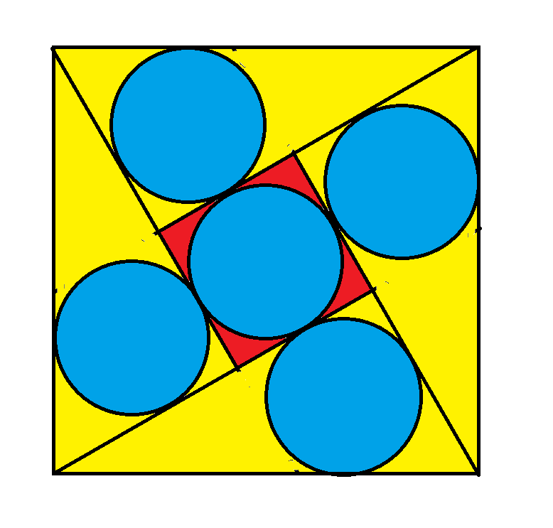يتكون الرسم البياني أعلاه من أربعة مثلثات قائمة ومربع صغير داخل مربع كبير. طول ضلع المربع الكبير يساوي 1. جميع الدوائر الخمس لها نفس القطر. ما هو نصف قطر هذا المربع؟