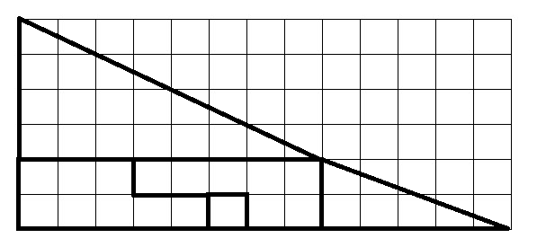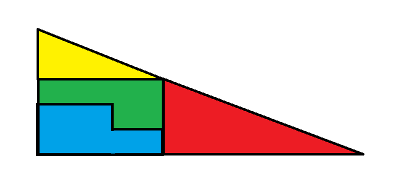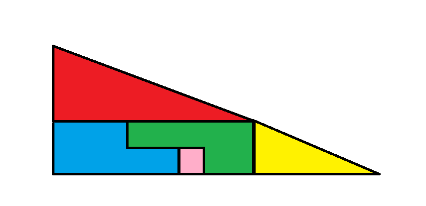 لاحظ أن المثلث الأحمر الكبير له ضلعان طولهما 4 و8. لاحظ أيضًا أن المثلث الأصفر الأصغر له ضلعان طولهما 2 و5. بمعنى آخر، المثلثان غير متناسبين. ميل وتر المثلثين ليس هو نفسه كما هو موضح في أي من الشكلين. ميل أحدهما 0.5 والآخر 0.4. وضع القطع كما هي في أي من الشكلين يجعل الشكل يبدو وكأنه مثلث كبير طول ضلعيه 5 و13، ولكنه ليس مثلثًا.