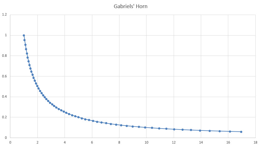 تخيّل بعد ذلك أن هذا المنحنى يدور حول المحور السيني. سيُشكّل ما يشبه القرن، بطرفٍ طويلٍ بلا حدود. هل هذا ما يُطلق عليه علماء الرياضيات قرن جبرائيل؟