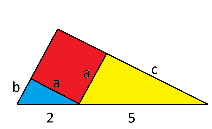 افترض أن أضلاع مربع طول ضلعه أ ممتدة على خط أسفل المربع، مما ينشئ مسافتين 2 و5 على الخط.