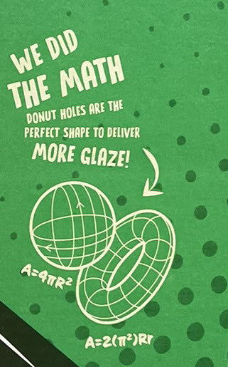 إنهم يذكرون بشكل صحيح أن مساحة سطح الكرة، أو ما قد يسمونه على الأرجح حفرة الدونات، هي 4πr 2 ، حيث r = نصف القطر.