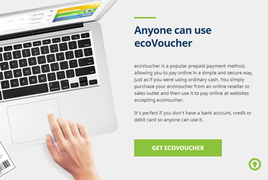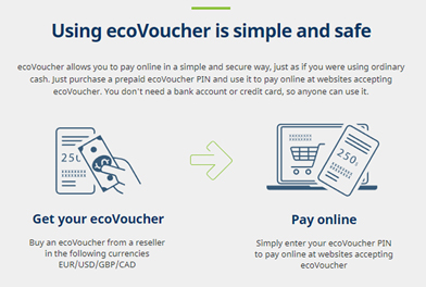 أصبح منتج ecoVoucher مسبق الدفع من PSI-Pay متاحًا في عام ٢٠١٦ كإضافة عملية لبطاقة ecoCard الشهيرة. وكما يوحي الاسم، فهو نظام قسائم افتراضية مسبقة الدفع يوفر الأمان والحماية التي لا توفرها إلا الشركات المرخصة من هيئة السلوك المالي. وهو مثالي للمستخدمين في كندا - سنتحدث عنه لاحقًا - حيث يمكن للعملاء الحصول عليه من شبكة متاجر Payment Source في كندا أو عبر بائعي التجزئة الإلكترونيين. تعبئة القسيمة سهلة للغاية، ما عليك سوى اختيار قيمة مسبقة الدفع، والإنفاق سهل للغاية، ما عليك سوى إدخال رقم التعريف الشخصي (PIN) الفريد عبر الإنترنت.