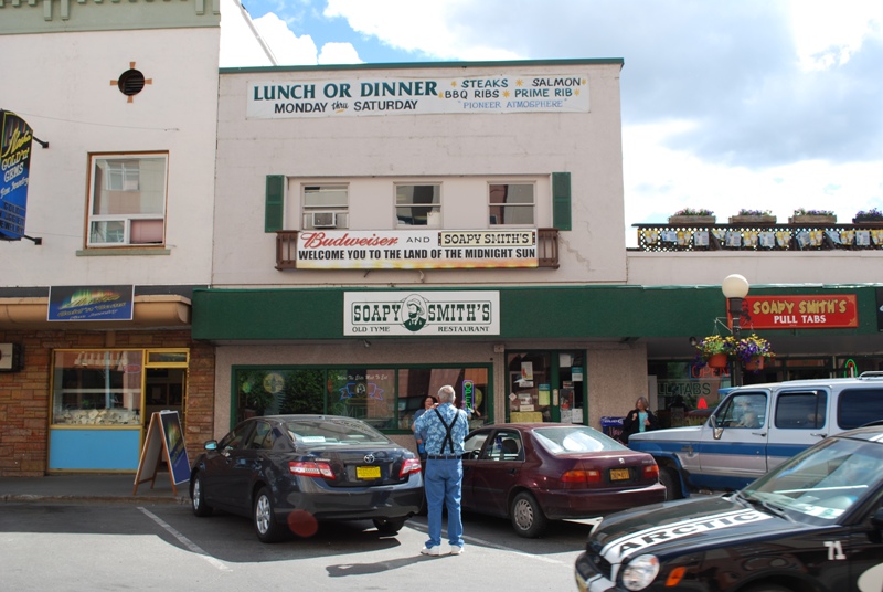 وسط مدينة فيربانكس مُخيّب للآمال نوعًا ما. يبدو أنه يعاني من هجرة الطبقة المتوسطة إلى الضواحي، وهو ما يُصيب العديد من المدن الأمريكية. يُطلّ المطعم على ضفة نهرية رائعة، مع مساحات خضراء واسعة. تناولنا الغداء في مطعم "سوبي سميثز أولد تايم". كانت الجدران مُغطاة بديكورات سياحية ألاسكا المُعتادة، من أحذية ثلجية وقرون غزال وما شابه. في منتصف زيارتنا، تحدّث صاحب المطعم مع الزبائن عن تاريخ عائلته في السياسة في ألاسكا وعن المطعم. قال إنه حفيد حاكم سابق لألاسكا. بشكل عام، كان المطعم مُبتذلًا بعض الشيء، لكنه مع ذلك كان ممتعًا، والطعام لم يكن سيئًا.