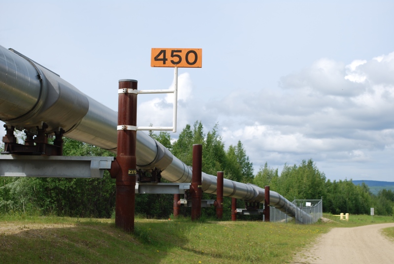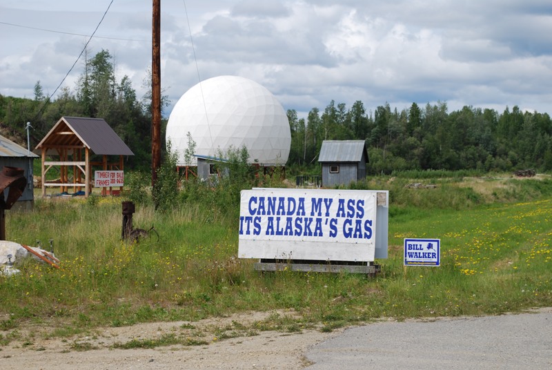 في رأيي، يُعدّ خط أنابيب ألاسكا أحد أعظم قصص النجاح الهندسي في أمريكا، لذا شعرتُ بالفخر لرؤيته لأول مرة. على الجانب الآخر من الطريق السريع، كانت هناك لافتة كبيرة كُتب عليها: "يا كندا، إنه غاز ألاسكا"، وهو شعور قرأته عدة مرات خلال رحلتي. يُشير هذا إلى مقترحات مزدوجة لبناء خط أنابيب ثانٍ للغاز الطبيعي، إما خط قصير متصل بخط أنابيب كندي، أو خط أطول على نفس مسار خط أنابيب النفط الحالي.