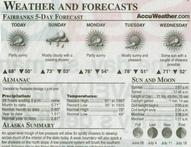 عادةً، عندما يُشير أحدهم إلى "شمس منتصف الليل"، فإنه يقصد أنها لا تغرب. يحدث هذا فقط في أوقات محددة من السنة فوق الدائرة القطبية الشمالية وتحت الدائرة القطبية الجنوبية. لا تزال فيربانكس تبعد حوالي 200 ميل جنوب الدائرة القطبية الشمالية، لذا حتى في أطول يوم في السنة، تغرب الشمس. مع ذلك، كما شرحتُ في الجزء الثاني من رحلتي إلى ألاسكا، كان الجو لا يزال ساطعًا في الخارج خلال الساعات القليلة بين غروب الشمس وشروقها. وكما تُظهر قصاصة الصحيفة هذه، في ذلك اليوم في فيربانكس، غربت الشمس الساعة 12:46 صباحًا وشرقت الساعة 2:57 صباحًا، لمدة 21 ساعة و49 دقيقة من سطوع الشمس. لا يزال اليوم يفصلنا يومان عن "أطول يوم في السنة". لذا، كان عنوان الرحلة مُضلِّلًا بعض الشيء، ولكن من يُبالي؟