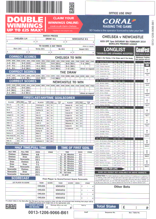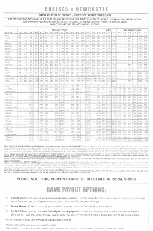 إليكم ورقة مراهنات من مباراة تشيلسي ونيوكاسل، التقطتها من الملعب. انقر على الصورة لعرضها بشكل أكبر. قمتُ بتحليل بعض الرهانات. لأي نوع من الرهانات، إذا افترضتُ عائدًا متوقعًا متساويًا على جميع النتائج، فسيكون كالتالي.