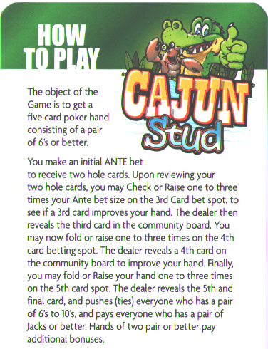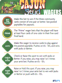 تبدو لي لعبة Cajun Stud مشابهةً لـ Mississippi Stud Poker مع إضافة بعض الرهانات الجانبية. من Galaxy Gaming.