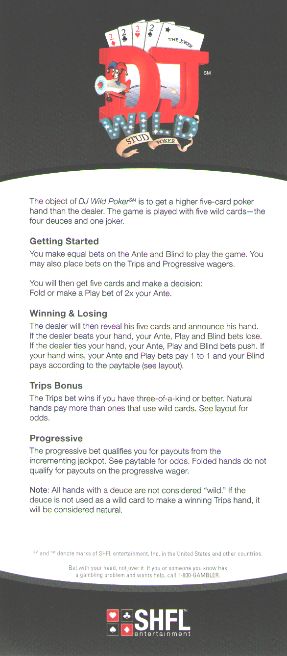 يبدو أن لعبة DJ Wild تشبه لعبة Caribbean Stud Poker ، باستثناء أن الورقتين الثانيتين والجوكر الفرديتين تعتبران Wild، مع وجود رهانين جانبيين. من إنتاج SHFL Entertainment.