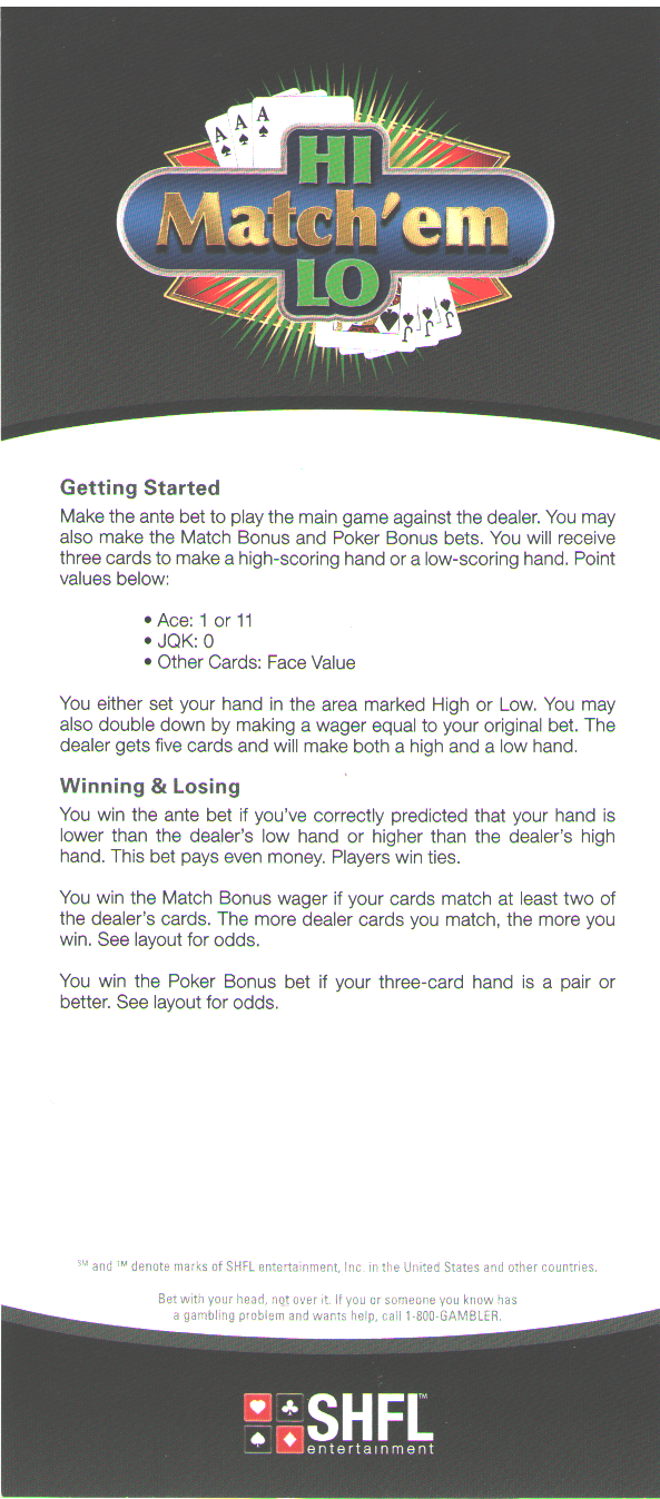 هذه إحدى الألعاب الجديدة القليلة في المعرض من علامة تجارية رائدة. تُحسب قيمة البطاقات كما في لعبة البلاك جاك، باستثناء أن قيمة البطاقات ذات الوجه صفر. يحصل اللاعب على ثلاث بطاقات، ثم يختار اللعب بيده عالية أو منخفضة ضد الموزع، مع خيار رفع الرهان. يحصل الموزع على خمس بطاقات، ويكوّن يدًا عالية ومنخفضة. إذا تغلبت على الموزع في الاتجاه الذي اخترته، فستفوز. بالطبع، هناك رهان جانبي أيضًا. من إنتاج SHFL Entertainment.