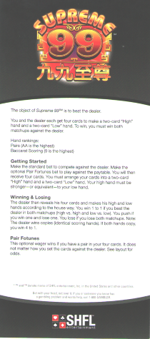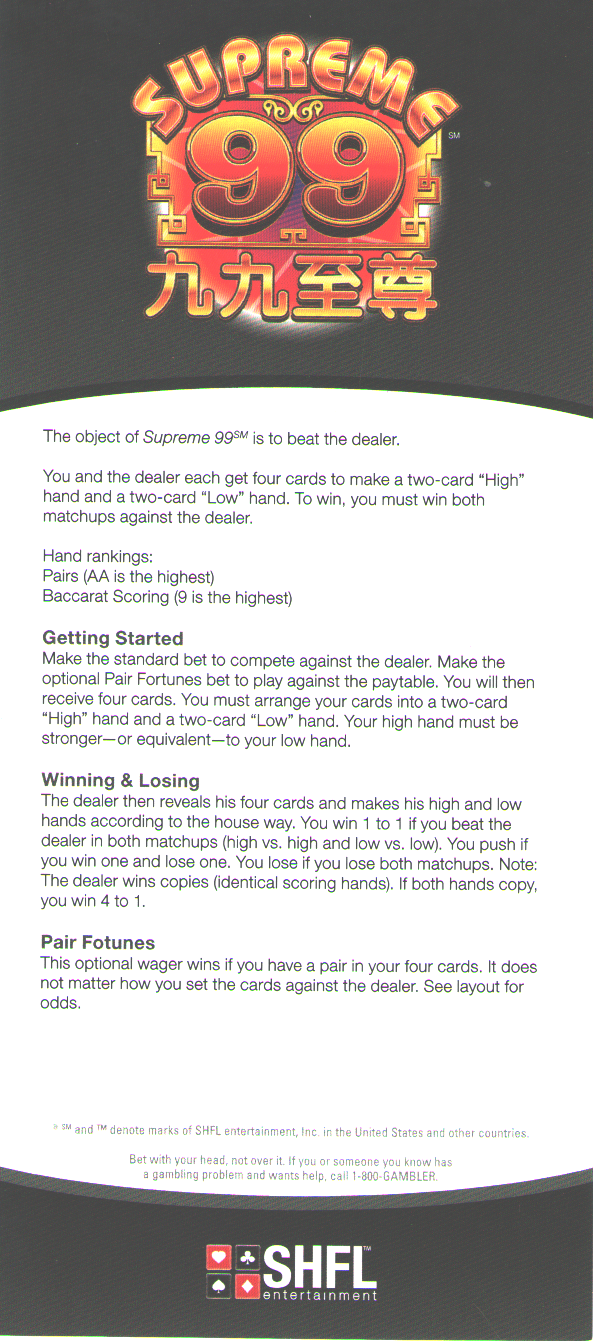 أقرب لعبة يمكن مقارنة Supreme 99 بها هي لعبة pai gow (البلاط) .مع ذلك، تستخدم اللعبة البطاقات بدلاً من البلاط. وكما هو الحال في باي غاو، يحصل كل من اللاعب والموزع على أربع بطاقات ويرتبونها في يدين من ورقتين. يشبه ترتيب البطاقات في باي غاو ترتيب البطاقات من حيث ارتفاع الأزواج، ثم يخضع لقواعد تسجيل الباكارات. تُقارن اليدين العاليتين مع اليدين المنخفضتين. إذا فاز اللاعب في كلتا الحالتين، فإنه يربح مبلغًا متساويًا بدون عمولة. تأتي ميزة الكازينو بالكامل من فوز الموزع بنسخ البطاقات. وأخيرًا، هناك رهان جانبي على ما إذا كان اللاعب سيحصل على أي زوج من بطاقاته الأربع.