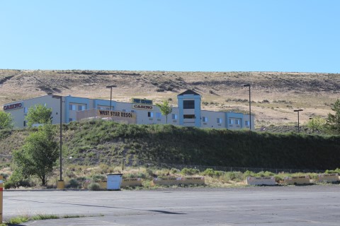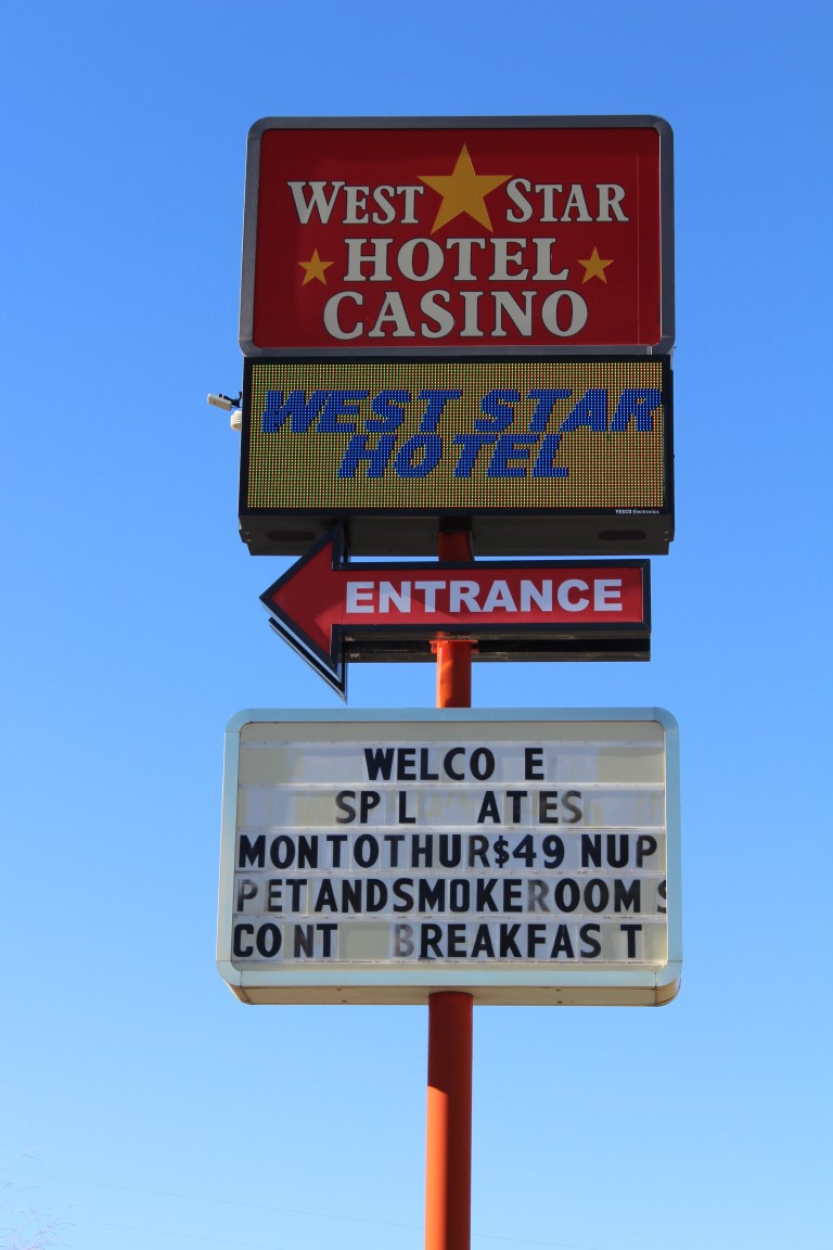 على حد علمي، اسم الكازينو هو بوني إكسبريس، واسم الفندق هو منتجع ويست ستار. الكازينو صغير جدًا، ويضم 42 ماكينة قمار فقط، ولا يحتوي على أي طاولات. بالمقارنة، كان الفندق كبيرًا. مع ذلك، يبدو لي أن تسميته منتجعًا إساءةً للكلمة.