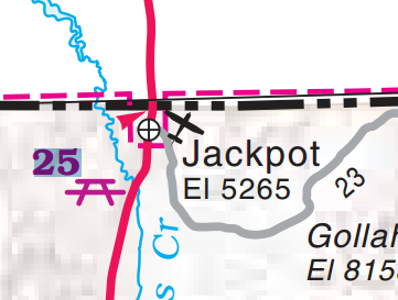 جاكبوت، نيفادا، بلدة حدودية صغيرة تقع شمال شرق نيفادا، جنوب حدود ولاية أيداهو مباشرةً. في 29 يونيو/حزيران 2014، كنتُ عائدًا بالسيارة إلى منزلي في لاس فيغاس من سياتل، وهبطتُ في جاكبوت. قضيتُ الليلة في مطعم كاكتوس بيتس. هذه الصفحة تتناول زيارتي التي استغرقت يومًا واحدًا.تضم نيفادا العديد من المدن الحدودية التي تلبي احتياجات المقامرين من الولايات المجاورة. أبرزها لافلين، وميسكيت، ووست ويندوفر. جميعها تضم كل ما تجده في المدن الصغيرة، بالإضافة إلى الكازينوهات. هناك أيضًا بريم، لكنها لا تستحق أن تُسمى مدينة، لأنني لا أعتقد أن أحدًا يسكنها. مع ذلك، عندما يتعلق الأمر بمدن نيفادا الحدودية المميزة، فإن جاكبوت هي الأبرز.