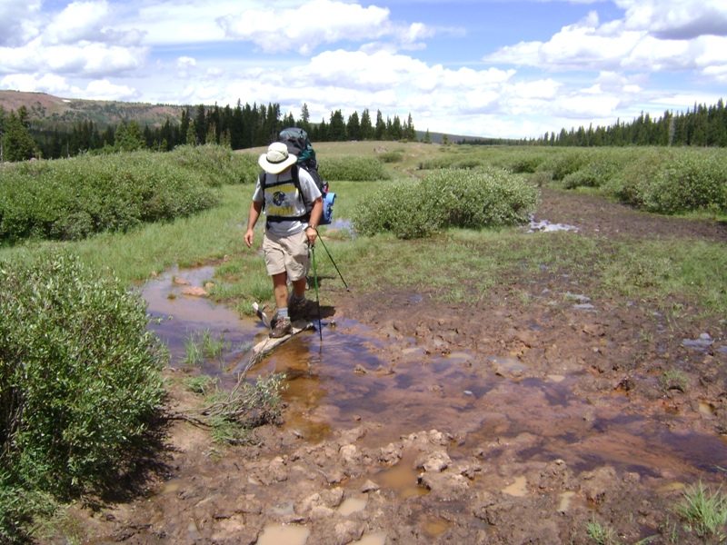 بعد عبور النهر، مرّ المسار عبر مصارف عشبية طويلة. في هذه الأثناء، ازدادت الجبال اتساعًا، وصغُرت الأشجار. كان هذا الجزء من الرحلة الأكثر جمالًا في رأيي. مع ذلك، فإنّ تكلفة المشي عبر مصارف المياه تكمن في أن أجزاءً منها كانت موحلة لدرجة أن قدمي كادت أن تخرج من حذائي وأنا أحاول إخراجها من الوحل. خلال الرحلة إلى بحيرة دولار، مررنا بما لا يقل عن 100 متجول قادمين من الاتجاه المعاكس. بدا جميعهم تقريبًا كرجال في أوائل العشرينات من عمرهم، وكان العديد منهم يحمل صنارات صيد. كنت أخشى أن تزدحم منطقة بحيرة دولار بهذا الكمّ الهائل من حركة المرور على المسار.