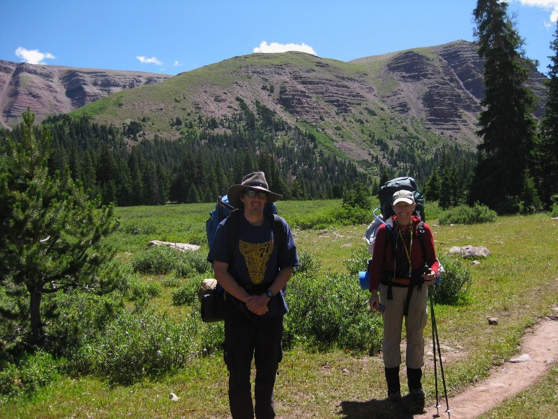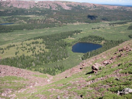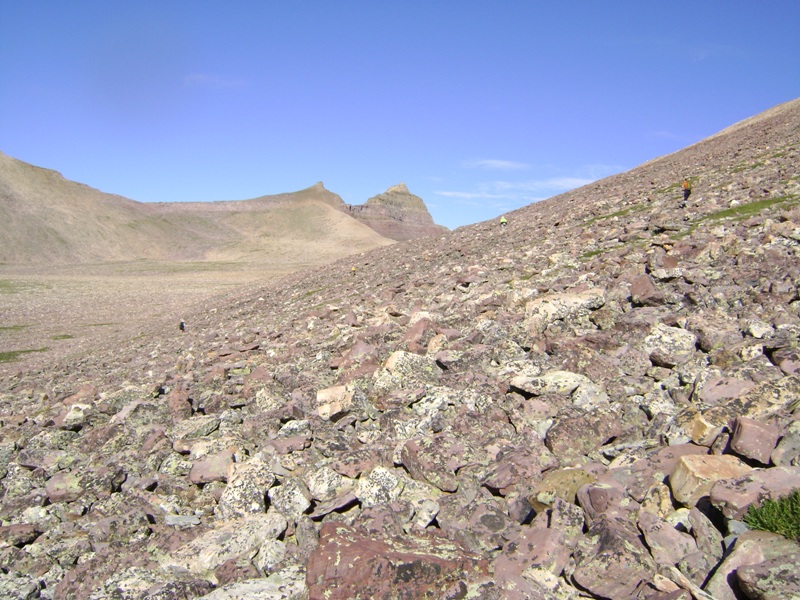 في طريق العودة إلى السيارة. خلف جاستين وأنا أول عقبة في طريقنا إلى قمة جيلبرت. في طريق النزول، لم نستطع تذكر مسارنا للصعود. سلكنا أنا وجاستين الطريق الطويل السهل على يسار الصورة. نزل جويل وهارلان الطريق شديد الانحدار، فوق رأس جاستين.
