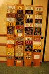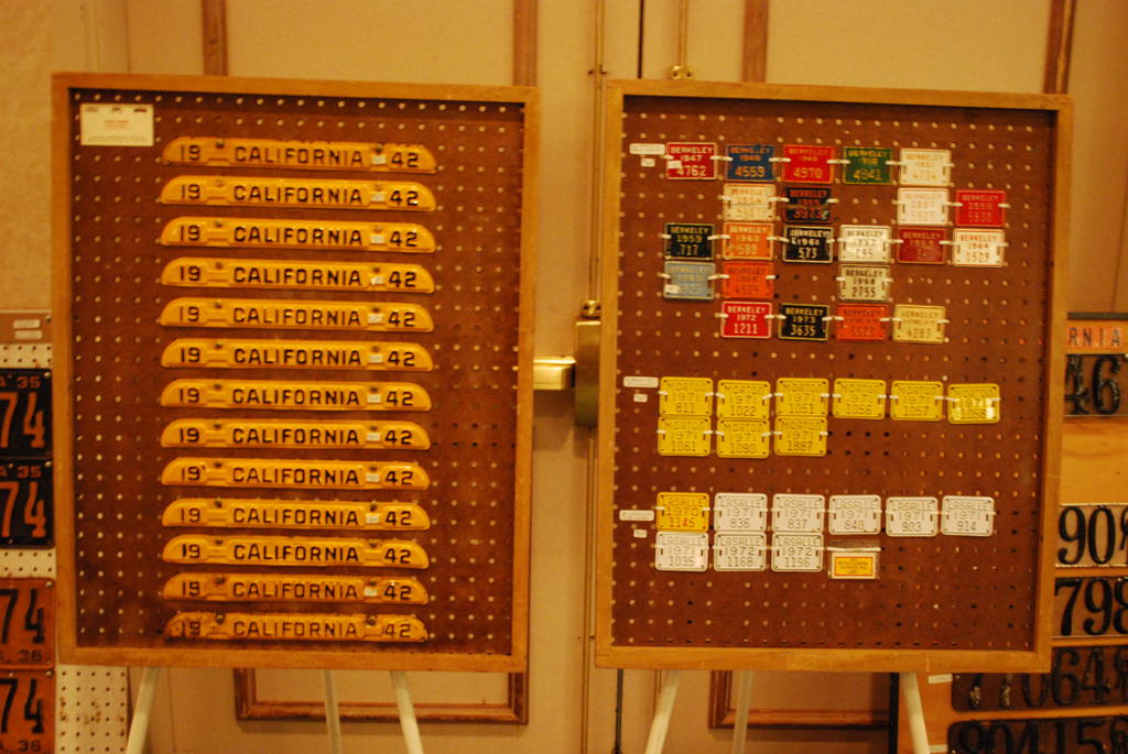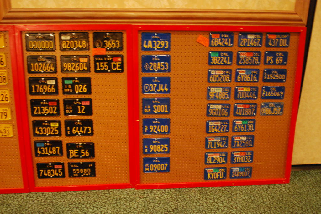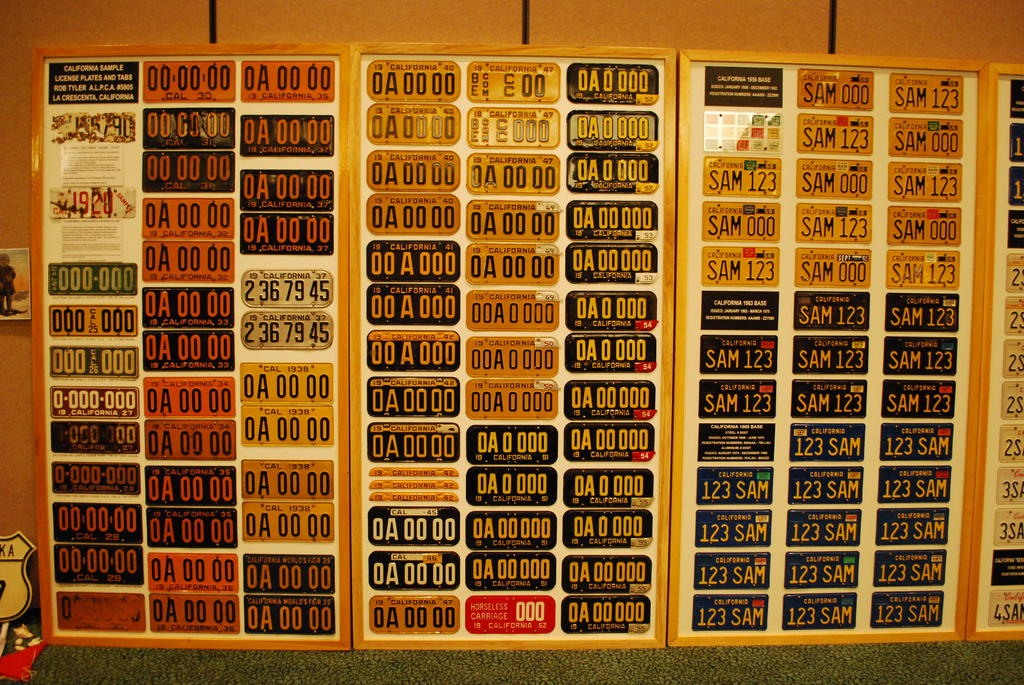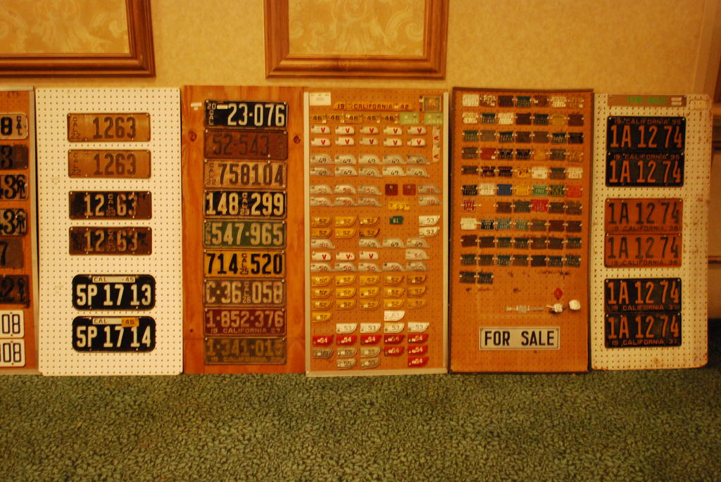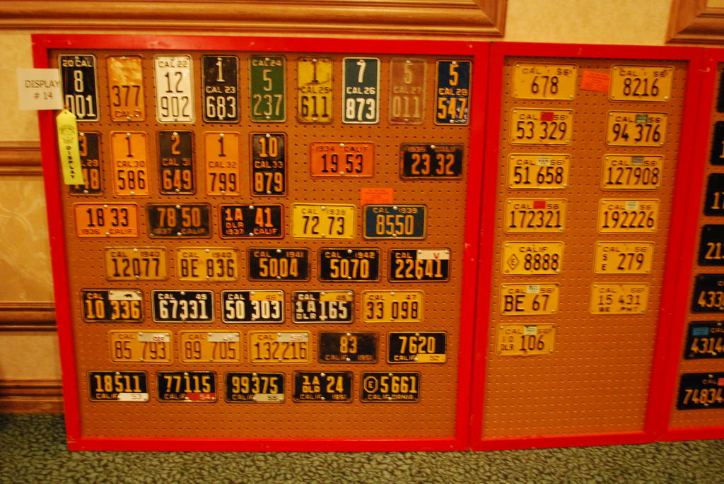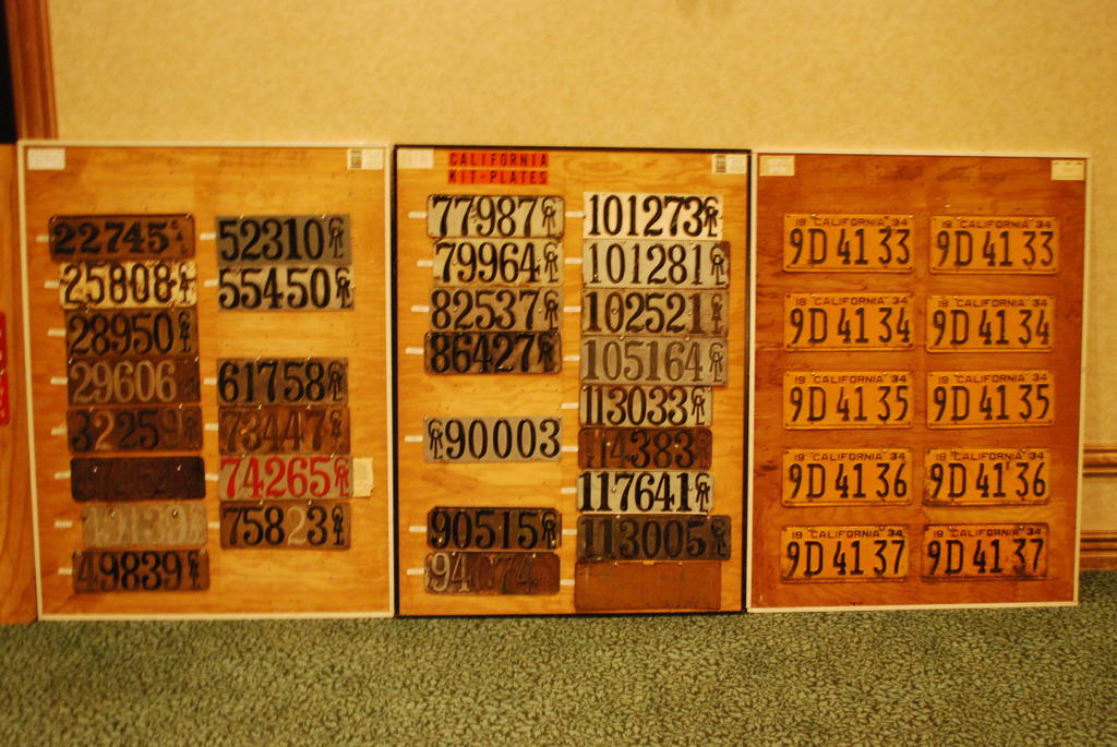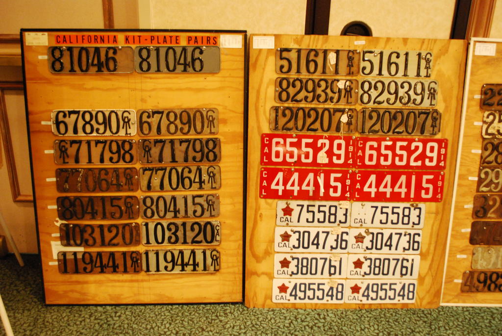 مجموعة رائعة من لوحات كاليفورنيا القديمة. تعود لوحات "المجموعات" إلى الفترة ما بين عامي ١٩٠٥ و١٩١٣، عندما لم تكن الولاية تُصدر لوحة ترخيص، بل كانت تُعطيك رقمك، وعليك صنع لوحة خاصة بك. كانت متاجر الأدوات المنزلية تبيع مجموعات لهذا الغرض، تتكون عادةً من قطعة معدنية أو شاشة، وأرقام منازل.
