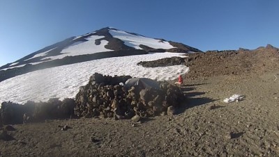 كان هذا أول صعود لأي منا ولم نرَ أي شخص يتسلق في اتجاهنا على مسافة قريبة طوال اليوم. كنت أعلم أننا نريد التخييم في مكان يسمى Lunch Box Counter، لكنني لم أكن متأكدًا تمامًا من مكانه. عندما ترك المسار خط الأشجار أصبح أكثر أو أقل كومة من الصخور البركانية. أينما كانت هناك بقعة مسطحة، بنى الناس ملاجئ للرياح للخيام. أفترض أن الأماكن السفلية كانت للأشخاص الذين يخططون للقيام بالتسلق في ثلاثة أيام. قد يكون من السهل الخلط بين بعض مناطق التخييم هذه و Lunch Box Counter. ومع ذلك، فهي ليست كذلك. بعد منطقة مسطحة بها حوالي اثني عشر موقعًا للتخييم يوجد حقل جليدي طويل وشديد الانحدار. يستغرق الأمر ساعة على الأقل لتسلق هذا الحقل للوصول إلى Lunch Box Counter، والذي ينتشر على مساحة كبيرة على جزر صخرية في منتصف الحقل الجليدي. كان المكان الذي أقمنا فيه المخيم في الطرف السفلي من منطقة Lunch Box وكان لدينا جزيرة صخرية كبيرة بها العديد من مواقع التخييم، كلها لأنفسنا.