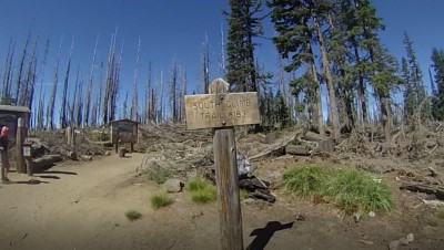 يبدأ المسار في غابة محترقة، ويستمر على هذا النحو لبضعة أميال. مع أن هذا الجزء من الرحلة كان شاقًا بعض الشيء، إلا أننا استمتعنا بمناظر خلابة لجبل هود، ثم جبل سانت هيلينز لاحقًا، مع ازدياد ارتفاعنا. وأخيرًا، غادرنا المنطقة التي دمرها حريق غابة سابق، ورأينا أشجارًا حية وحقولًا من نبات الترمس (الذي أشرت إليه خطأً بالخزامى في فيديو التسلق).