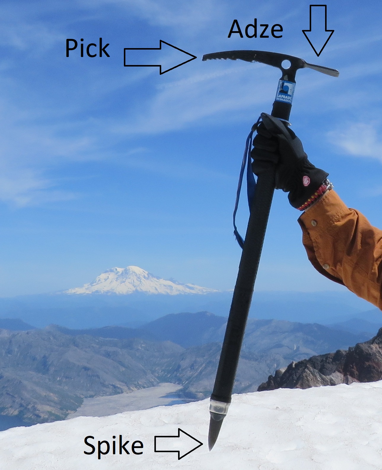 الطريقة الصحيحة لإمساك فأس الجليد أثناء الانزلاق هي تمريره بشكل عرضي على جسمك مع وضع النتوء على الجانب الأيمن (إذا كنت تستخدم يدك اليمنى)، ودفع النتوء على الجليد حسب السرعة التي تريدها. هذا سهّل عليّ التحكم في سرعتي وبجهد أقل بكثير. أين كان هؤلاء المحسنون في الأعلى؟ على الأقل تجاوزنا بعض المتسلقين الصاعدين وهم يحملون فأس الجليد بشكل صحيح. أنا متأكد من أن العديد ممن التقينا بهم قبل محاضرتنا فكروا في أنفسهم: "هؤلاء الحمقى يمسكون بفؤوس الجليد بشكل خاطئ".