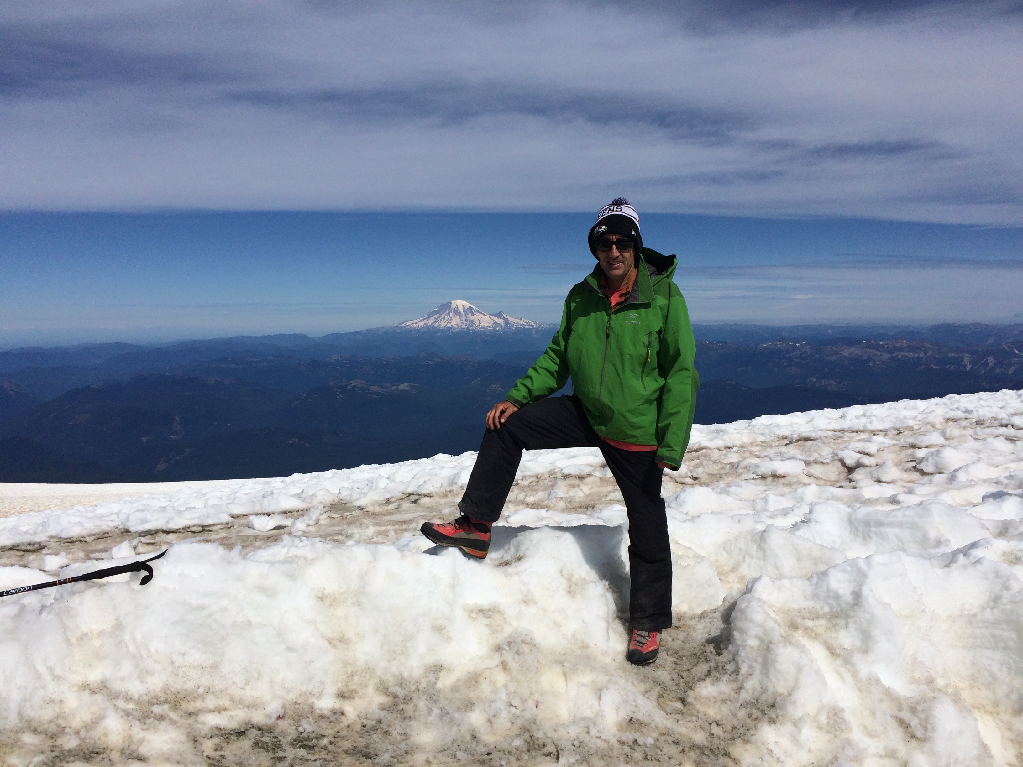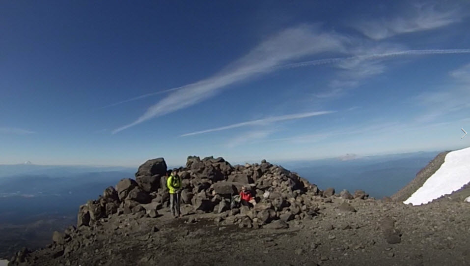 كانت المناظر من القمة خلابة. بمجرد وصولنا، حظينا برؤية واضحة لجبل رينييه شمالًا، وهو ما لم أره منذ صعودي إليه قبل عامين. غربًا كان جبل سانت هيلينز، وجنوبًا جبل هود وجبل جيفرسون، وبالكاد استطعت تمييز الأخوات الثلاث. بعد التقاط الصور والفيديوهات الإلزامية للقمة، تبادلنا أطراف الحديث مع زملائنا المتسلقين صباح ذلك الجمعة، 25 أغسطس/آب 2017. إن شعور النشوة الذي نشعر به عند مشاركة القمة يكون دائمًا أفضل.