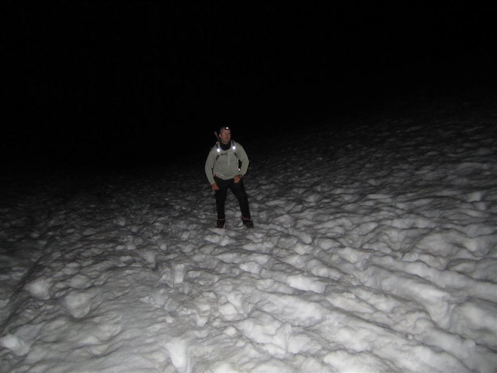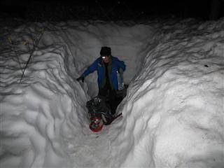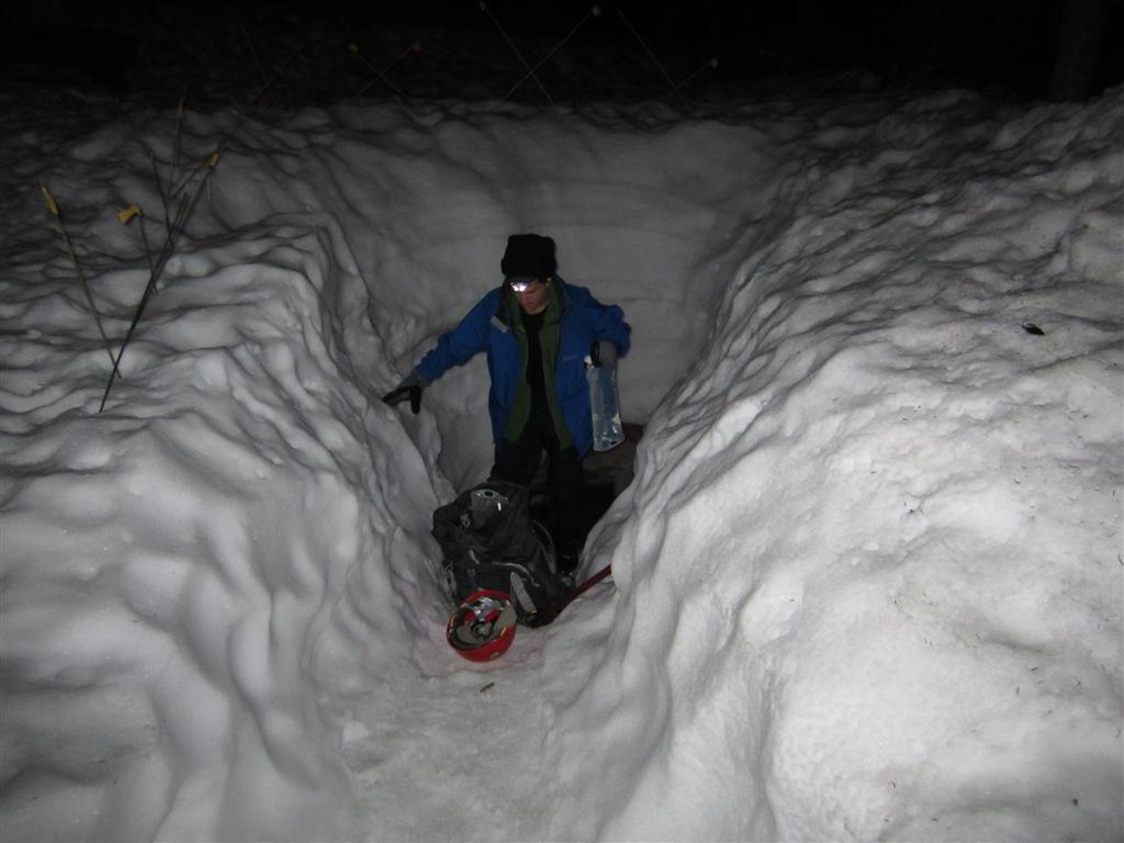 في الموعد المحدد، حزمنا معداتنا، وارتدينا طبقات من الملابس الشتوية، وانطلقنا في الظلام. لم يبزغ القمر إلا بعد ساعتين تقريبًا، ولم يُعلَّم المسار في أي مكان. اكتسبنا معرفتنا بالمسار من خلال ما قرأناه في الكتب والتقارير الإلكترونية. وأعني بـ "نحن" إريك، الذي كان أكثر من قام بالدراسة مسبقًا. ومع ذلك، في وسط الثلج والأشجار في منتصف الليل، لم يُجدِ هذا الاجتهاد نفعًا. كان قرارنا الجماعي بشأن الطريق الذي سنسلكه يعتمد بشكل أساسي على تتبع آثار أقدام المتسلقين السابقين في الثلج. سار الأمر على ما يرام لفترة، لكن آثار الأقدام تضاءلت تدريجيًا واختفت في بقع من الثلج الصلب جدًا.