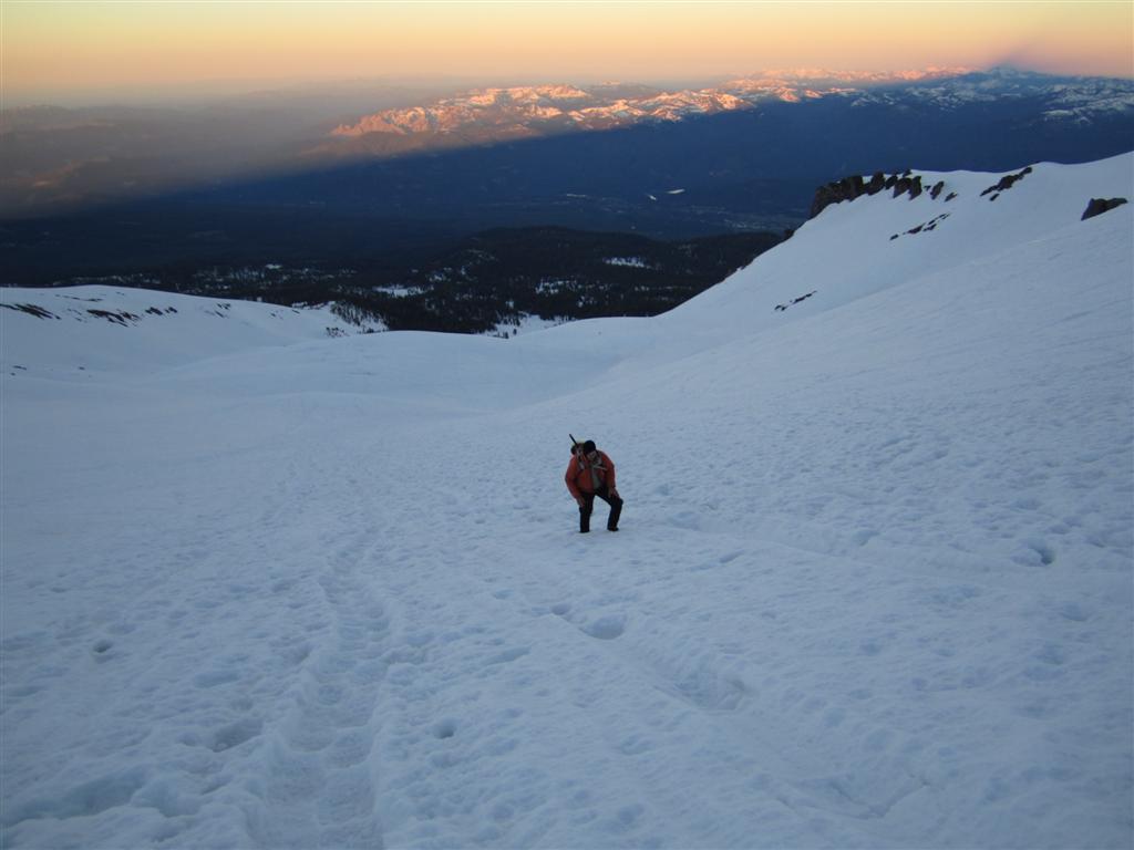 عند سفح وادي أفالانش، أصبح الثلج رطبًا وطريًا جدًا بحيث لم نتمكن من الانزلاق أكثر، فاضطررنا للسير مجددًا. في لحظة ما، غرقتُ عميقًا في الثلج لدرجة أنني اضطررتُ لاستخدام فأس الجليد لأحفر لنفسي. حاولنا الانزلاق في بضع نقاط بعد بحيرة هيلين، لكن الثلج كان لينًا جدًا في معظمه. لذا، كانت مسيرة بطيئة وحارة عبر الثلج الرطب عائدين إلى السيارة.