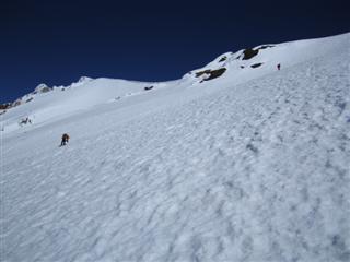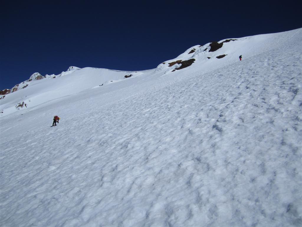 بعد بحيرة هيلين بقليل، بدأ التسلق بجدية. ارتدينا خوذاتنا، وجهّزنا فؤوس الجليد، وصعدنا وادي أفالانش مثل جميع النمل الذي سبقنا. يُشكّل هذا الجزء من المسار حوالي نصف الارتفاع الإجمالي. إنه الجزء الأكثر انحدارًا؛ لذا، ستحتاج إلى فأس جليد لمساعدتك على الصعود، بالإضافة إلى "الحماية الذاتية" في حال انزلقت وبدأت بالانزلاق. تُعدّ هذه السقوطات غير المُتحكّم بها سببًا للعديد من الحوادث في شاستا. علمتُ لاحقًا أنه في اليوم السابق لتسلقنا، سقطت مُتنزهة في هذا الجزء. كل ما أعرفه هو أن طائرة هليكوبتر هبطت في بحيرة هيلين، واضطرّ مُنقذان إلى الصعود لإحضارها ونقلها على نقالة إلى المروحية. في المجمل، انتظرت ساعات طويلة للحصول على المساعدة.