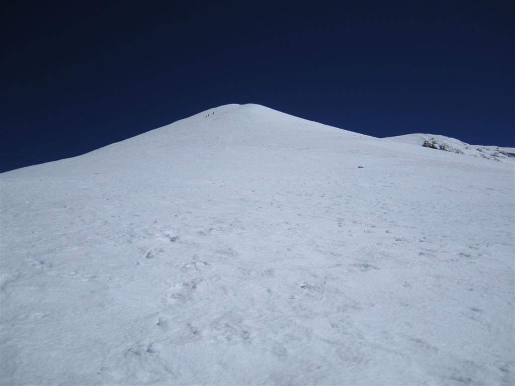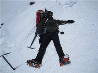ببطءٍ وثبات، وصلتُ أخيرًا إلى قمة التل. لم أكن قد اطلعتُ على المسار مُسبقًا، لذا لم أكن أعرف ما أتوقعه بعد ذلك. ما رأيتُه كان القمة واضحةً للعيان، لكنها لا تزال بعيدةً، على بُعد نصف ميل تقريبًا وارتفاع 300 قدم. هناك، انهارتُ قليلًا لأُعيد ترتيب أفكاري وأُهدئ من روعي. شجّعني شريكي، جويل، على المُضي قدمًا، إذ كنا على وشك الوصول. كان من اللطيف منه أن ينتظر معي، فكلما طال الوقت، أصبح الثلج أكثر ليونةً، مما يُصعّب النزول.