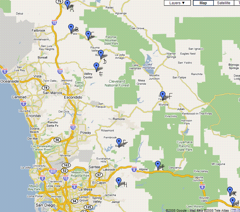 كما ترون من الخريطة، خمسة منها (بيتشانغا، بالا، باوما، هاراز، وفالي فيو) متجمّعة في الجزء الشمالي من المقاطعة. في الواقع، تقع بيتشانغا على حدود المقاطعة مباشرةً، في مقاطعة ريفرسايد. ثلاثة منها (فيخاس، غولدن أكورن، ولا بوستا) تقع على الطريق السريع I-8، في الجزء الشرقي من المقاطعة. أما الثلاثة الأخرى (بارونا، سيكوان، وسانتا إيزابيل) فهي متفرّقة، ولا تندرج بسهولة ضمن مجموعة. فيما يلي تعليقاتي على كل كازينو على حدة، من الشمال إلى الجنوب.
