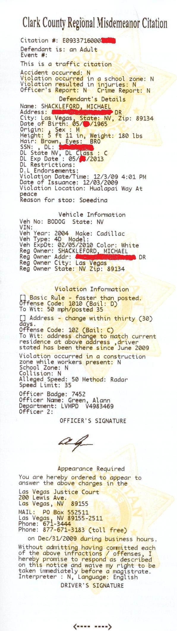 فألقى عليّ محاضرة قصيرة مفادها أنه إذا لم أُصحّح العنوان، فستُنقل ملصقات سيارتي لعام ٢٠١٠ إلى عنواني القديم وستنتهي صلاحية لوحات ترخيصي. حينها، ظننتُ أنني ربما لم أُملأ نموذج إدارة المركبات الآلية (DMV) بشكل صحيح، لذا منحته فرصة الشك. بعد ذلك، طلب مني توقيع مخالفة سرعة وعنوان خاطئ في لوحة التسجيل. قال إنه إذا ذهبتُ إلى إدارة المركبات الآلية (DMV) خلال ٣٠ يومًا وأصلحتُ مشكلة العنوان، يُمكنني الحصول على إسقاط غرامة العنوان الخاطئ.