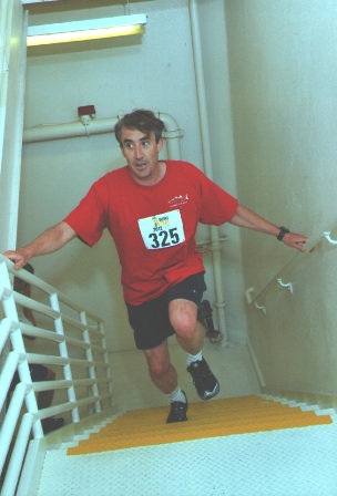 مهما كانت الطوابق معدودة، فقد خفت حماستي الأولية في النهاية. لا تُطلق عليّ السيدات لقب "عجائب الستين ثانية" عبثًا. في هذه المرحلة، كان عليّ أن أبطئ، وأخطو كل خطوة، وبسرعة مشي أسرع. في النهاية، استعدت رباطة جأشي وسرّعت من سرعتي، لكنها لم تكن بنفس سرعتي في البداية. كان الإيقاع الذي وجدته مناسبًا لي هو التناوب على صعود السلالم بين كل طابقين، ومحاولة الحفاظ على سرعة مشي ثابتة ولكن سريعة. خلال هذه الفترة، تجاوزت العديد من المتسلقين الآخرين. أستطيع أن أكون شخصًا تنافسيًا، وأستمتع دائمًا بالتفوق على الآخرين في أي شيء.