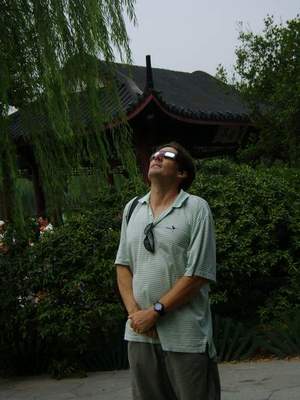 ثم غابت الشمس. فجأةً، أظلمت السماء تمامًا، مما دفع أضواء الشوارع إلى الإنارة. خيّم الصمت على الحشد. وكما تُظهر أي صورة كسوف، ظهرت هالة حول القمر. استطعتُ رؤية كوكب بوضوح، وربما كنتُ لأرى بعض النجوم لولا الضباب الرطب وتلوث الهواء المنتشر في الصين. عندما تُرى النجوم أثناء الكسوف، فهي تلك التي عادةً ما تنتظر ستة أشهر لرؤيتها، عندما تكون الأرض على الجانب الآخر من مدارها حول الشمس. عند هذه النقطة، تعجز الكلمات والصور عن تصوير اللحظة. عليك ببساطة أن تعيشها بنفسك لتعرف حقيقتها. وربما كانت اللحظة بالنسبة لي أعظم بفضل عقود التخطيط والترقب التي مررتُ بها.