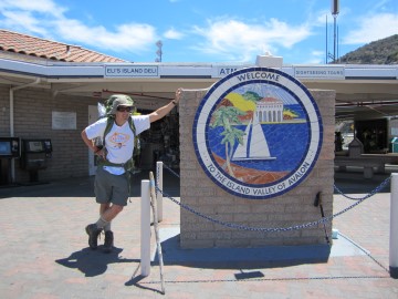 باعتباري كاتبًا متخصصًا في المقامرة، كان عليّ أن أحصل على صورة لهذه العلامات "البلاك جاك".كان يومنا الثاني سهلاً، إذ قطعنا سبعة أميال فقط، معظمها في اتجاه المنحدرات. كان أول ميلين صعوداً وهبوطاً على المزيد من التلال حتى وصلنا إلى مطار كاتالينا، المعروف باسم "مطار السماء". إنه مطار ساحر على الطراز الإسباني الكاليفورني المألوف، ويضم متجر هدايا صغيراً ومطعماً. استمتعنا بتناول وجبة هناك من طعام حقيقي، بدلاً من طعام التخييم الذي كنا نتناوله. في هذه المرحلة، كان ابني يشكو من كاحله. هناك حافلة نقل، تُعرف باسم "حافلة السفاري"، تنطلق من المطار إلى وجهتنا التالية، ليتل هاربور، لذلك اتخذتُ الحيطة ووضعتُ ابني في الحافلة وطلبتُ منه انتظاري في ليتل هاربور أثناء سيري على الطريق.