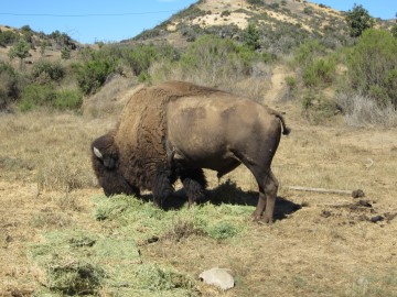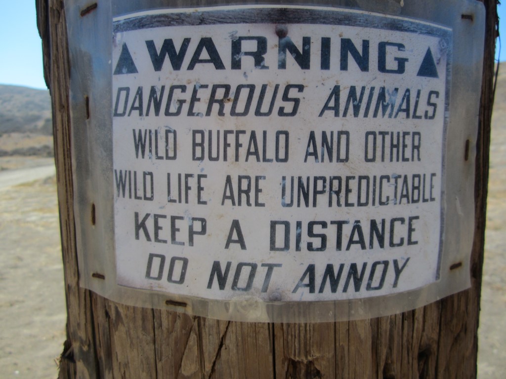 مررنا بأول بيسون لنا. ربما ما كان عليّ الاقتراب إلى هذا الحد، بناءً على ما أوحت به هذه اللافتة التي رأيتها في اليوم التالي. بالمناسبة، اللافتة، وأغلب من شاهدوها، يُطلقون عليه اسم الجاموس خطأً. الجاموس حيوان مشابه في الشكل، لكن قرونه أكبر، مثل جاموس الماء، ولا يوجد طبيعيًا في أمريكا الشمالية ( المصدر ).