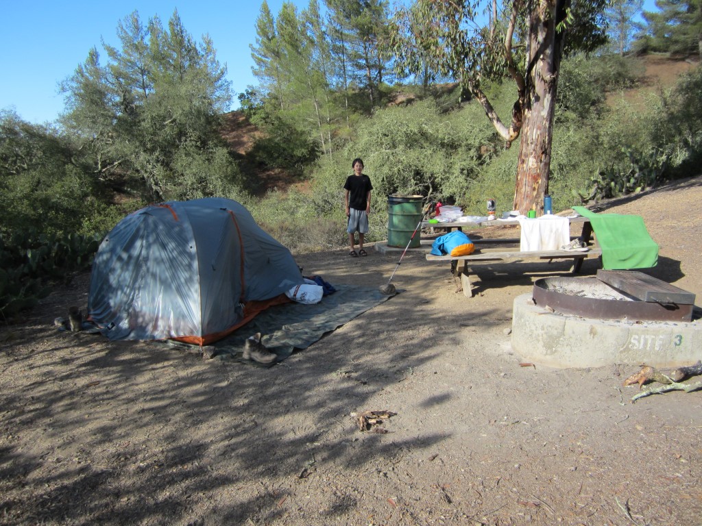 المخيم بحد ذاته موقع تخييم صغير وجميل يقع بين أشجار ظليلة في أعالي كاتالينا. يحتوي كل موقع تخييم على طاولة نزهة، وهو قريب من صنبور ماء. توجد مراحيض خارجية نظيفة ومُعتنى بها جيدًا. لم تكن هناك سوى مجموعة أخرى من المخيمين عند وصولنا. لاحظتُ ثعلبًا من جزيرة كاتالينا، في مكانٍ واضح، يتسكع حول مخيمهم، باحثًا بوضوح عن فرصة للسرقة أو الحصول على بعض الطعام.