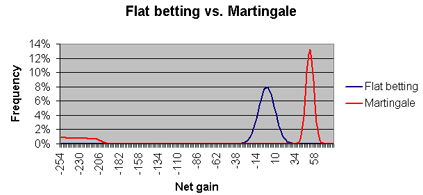 لإثبات هذه النقطة، أنشأتُ برنامجًا يحاكي نظامين، نظام مارتينجال والرهان الثابت، وطبقتُ كليهما بالمراهنة على خط المرور في لعبة الكرابس (التي تبلغ احتمالية فوزها 49.29%). يبدأ مراهن مارتينجال دائمًا برهان دولار واحد، ويبدأ الجلسة برهان 255 دولارًا، وهو ما يكفي لتغطية 8 خسائر متتالية. يراهن مراهن الرهان الثابت بدولار واحد في كل مرة. يلعب لاعب مارتينجال 100 رهان، أو حتى يعجز عن تغطية مبلغ الرهان. في هذه الحالة، يتوقف عن اللعب ويغادر بالمال المتبقي لديه. في حال خسارة رهانه المئة، يستمر في المراهنة حتى يربح رهانًا أو يعجز عن تغطية الرهان التالي. يلعب مراهن الرهان الثابت 100 رهان في كل مرة. كررتُ هذه التجربة لمليون جلسة لكلا النظامين، ثم سجلتُ النتائج. يوضح الرسم البياني أدناه النتائج: