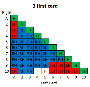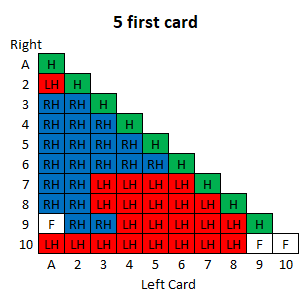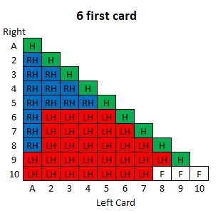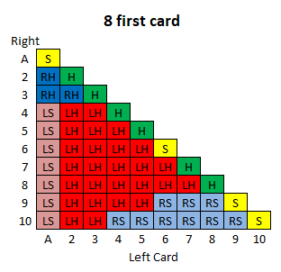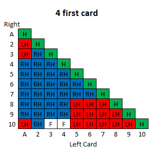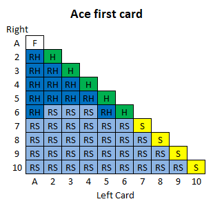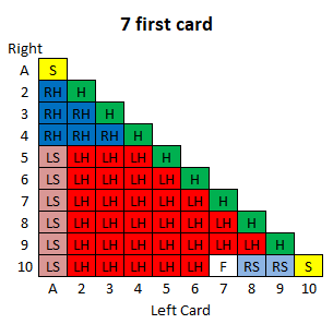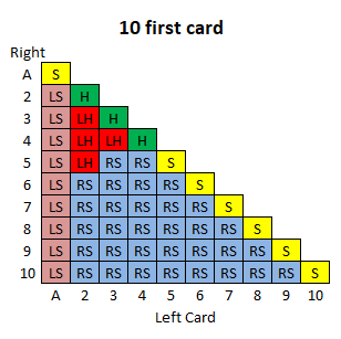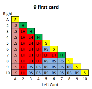 هناك عشرة جداول استراتيجية، واحدة لكل بطاقة لاعب أولية. لاستخدام كل جدول، ابحث عن البطاقة اليسرى في الصف السفلي والبطاقة اليمنى في العمود الأيسر. يتبع الجدول العاشر مفتاح.