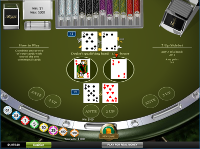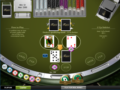 - رهان "٢ للأعلى" يُدفع بناءً على البطاقة الأولى للاعب والبطاقتين المشتركتين. يُدفع ٢٠ إلى ١ لثلاث بطاقات من نفس النوع، و٣ إلى ١ لزوج.