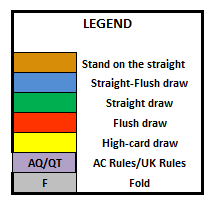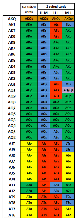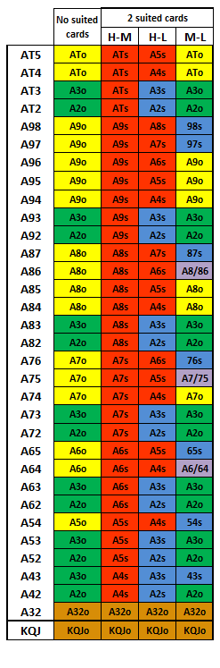 - AJx-A4x: - السحب لأي بطاقة Ax مناسبة. الأولوية الثانية هي السحب المباشر لبطاقة A3o أو A2o. الأولوية الثالثة هي السحب لأعلى بطاقتين.