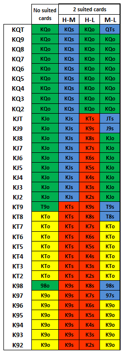 - AKx، AQx: – اسحب دائمًا إلى أعلى بطاقتين باستثناء عندما يمكنك السحب إلى AJs، ATs، A9s